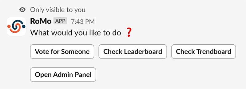 A leaderboard starts forming once people begin voting. To access the leaderboard in Slack, type /romo in any channel or DM, then click on “Check Leaderboard”.